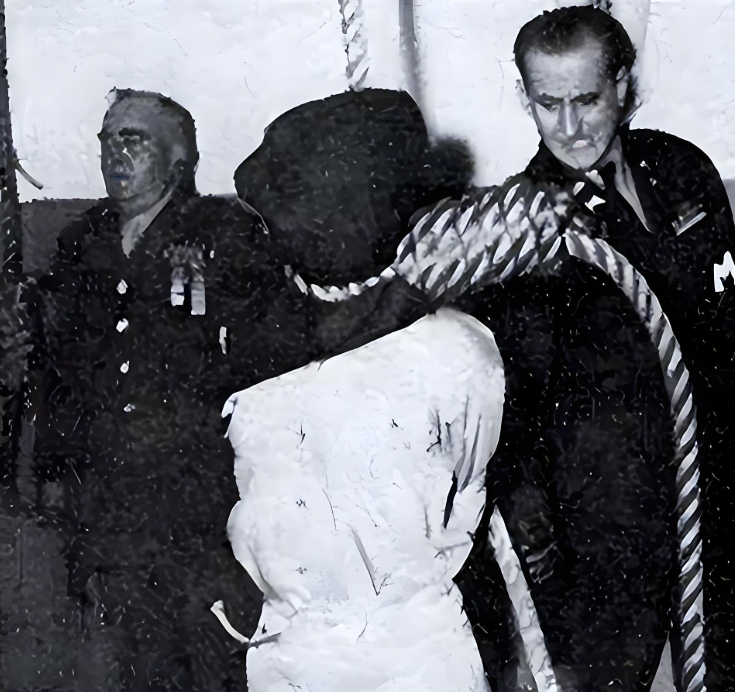 约翰·伍德中士下令将东条放上绞刑架,随后,东条跌落在绞刑架之中,只不过让众人没有料到的是,东条竟然没有直接死亡,而是整整坚持了10多分钟,只不过整个过程绳子把东条的脖子紧紧勒住。